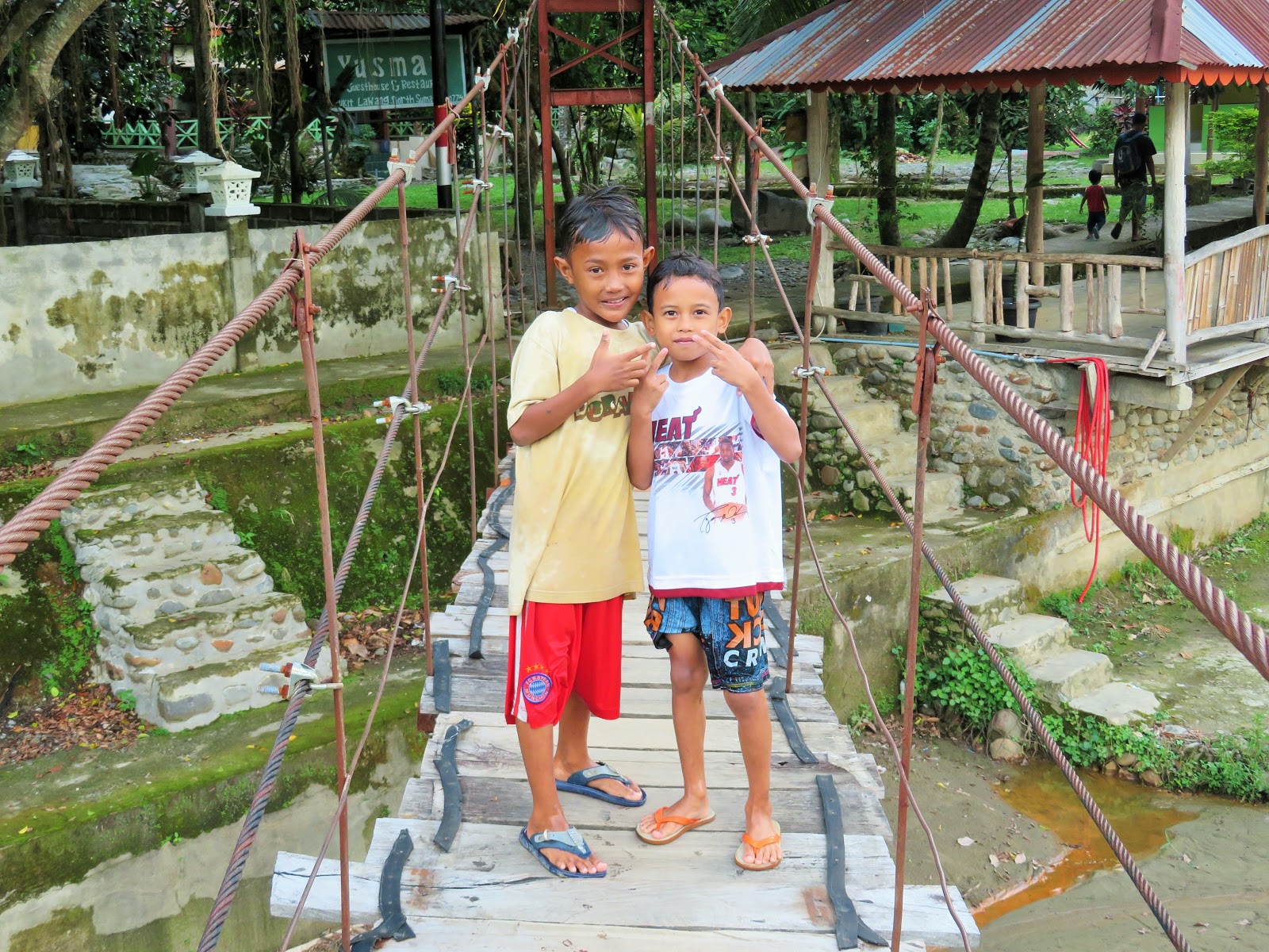 Una ruta curta, d'uns cent vint quilòmetres, meitat asfalt i meitat pista pedregosa, em porta fins a Bukit Lawang, un poble curiós, dedicat en bona part als visitants que volen veure la selva i l'observació d'orangutans. En arribar, em paro al centre de la vila i un home em ve a trobar, em pregunta que és el que cerco - Un hotel li dic - Segueix-me i sense dubtar-ho vaig darrere dels seus passos, travessa un pont penjant, estret i amb el paviment de fusta que li falten algunes llates, jo estic parat a l'entrada del pont, com preguntant, per aquí? Em fa un senyal perquè avanci i a poc a poc tot sentint el tentinegi del pont, arribo a l'altre costat i allà mateix al porxo de l'hotel on deixo la moto. Ens presentem, es diu Edy i em pregunta per quants dies estaré al poble, per poder-me oferir una visita a la selva. Allà mateix quedem per l'endemà a les set del matí per fer un trekking i un retorn a l'hotel lliscant pel riu amb una embarcació pneumàtica.
